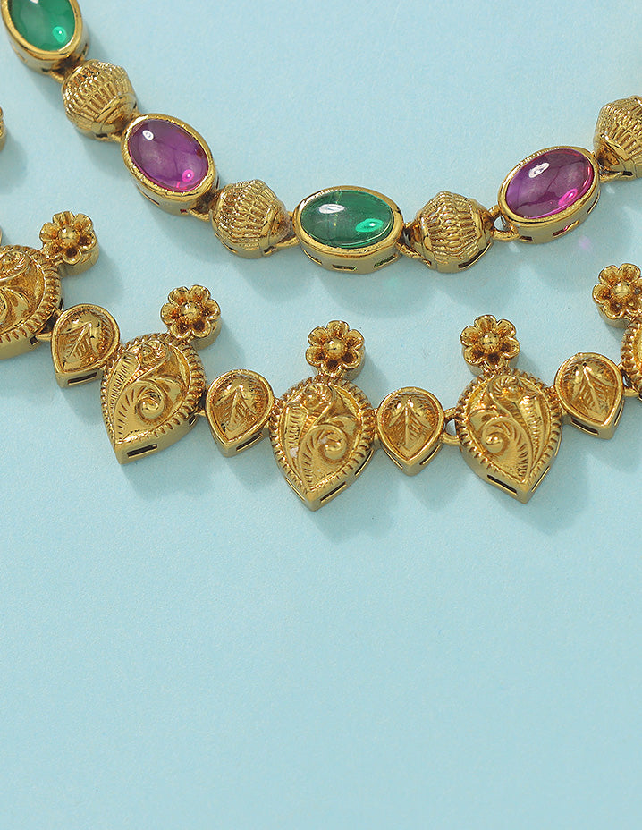 This Matt Polish Kempu Necklace Set, studded with dazzling ruby and emerald stones, radiates elegance and style. Its unique design is a visual treat, making it the perfect statement piece for any occasion.