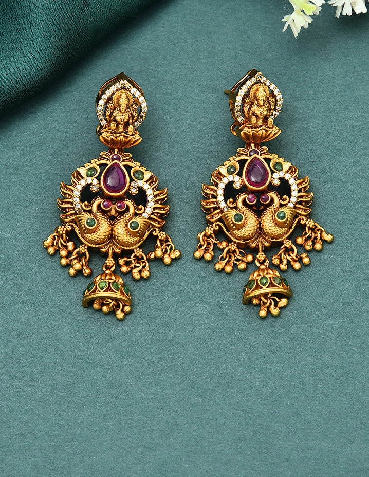The Designer Matt Zirconia Necklace Set features a stunning peacock design, adorned with exquisite Ruby, Emerald, and white stones of Lakshmi Devi. Expertly crafted, this set is sure to elevate any outfit and make a bold statement. Experience luxury and elegance with this one-of-a-kind necklace set.