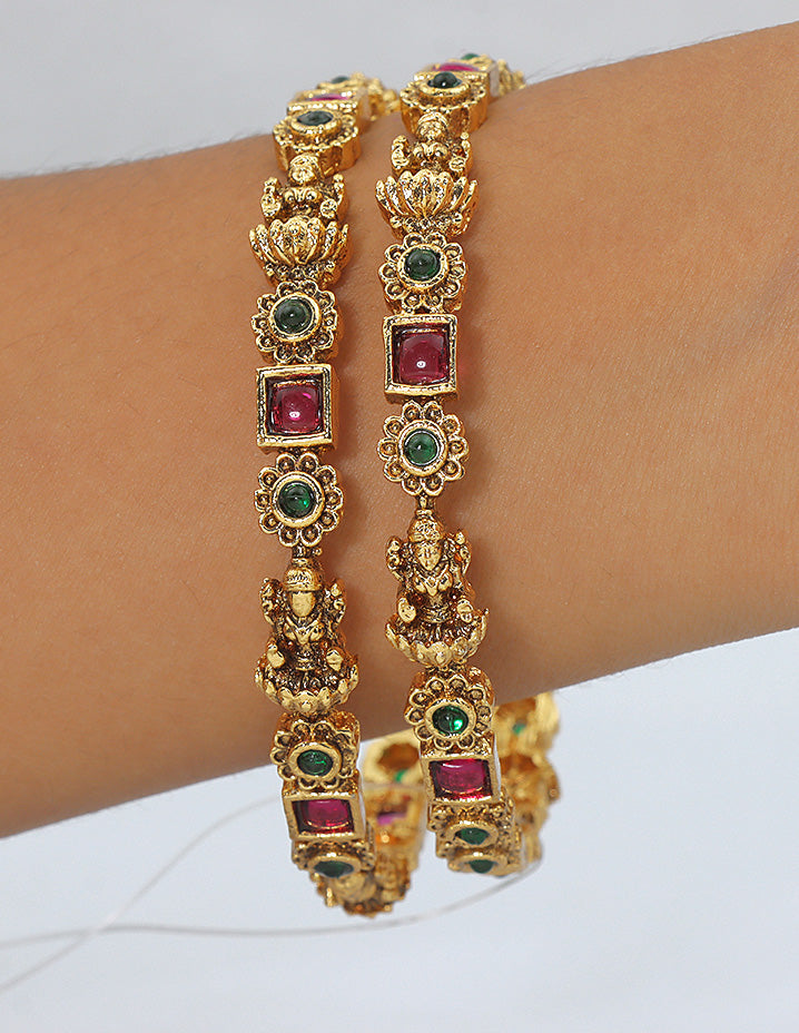 A stunning pair of gold-finish bangles adorned with intricate floral carvings and vibrant red and green stone accents—perfect for festive elegance or timeless tradition.