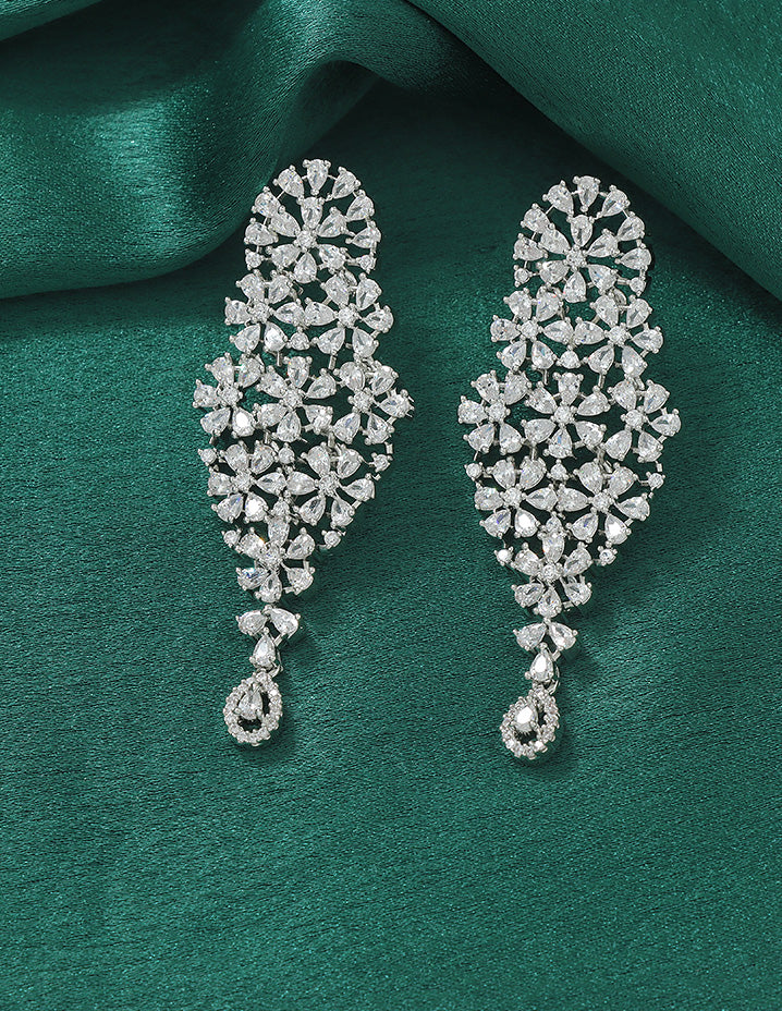 A radiant Rhodium-toned necklace and earring set adorned with sparkling Bud and floral motifs, perfectly blending elegance and charm for your special occasions.
