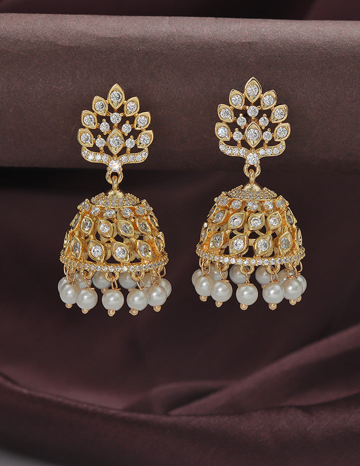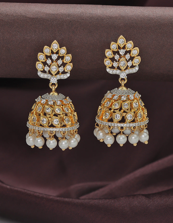 Designer earrings are classic jhumka-style danglers with a fusion of traditional and contemporary design. The bell-shaped drop is richly embellished with white stones and tear-drop dangles, paired with a sparkling oval top.