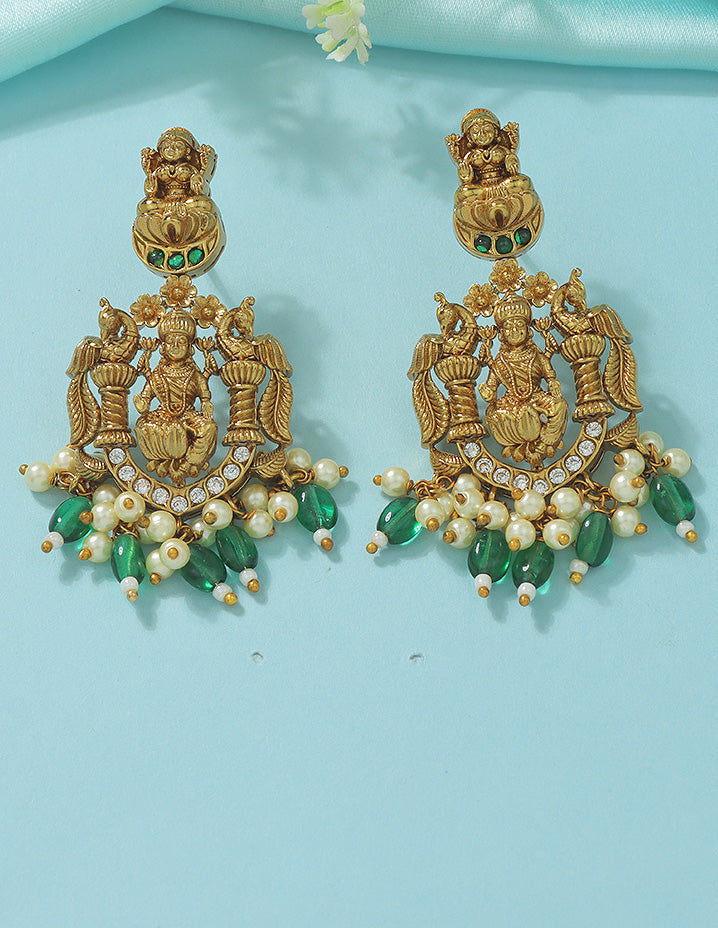 A majestic gold-toned necklace set adorned with CZ and Emerald stones, finished with delicate pearl clusters. Perfect for weddings and festive occasions, this regal set includes a matching pair of statement earrings to complete your traditional ensemble.