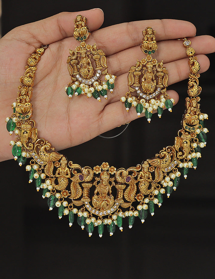 Designer Zirconia Royal Eemerald Beads Kempu Necklace Set