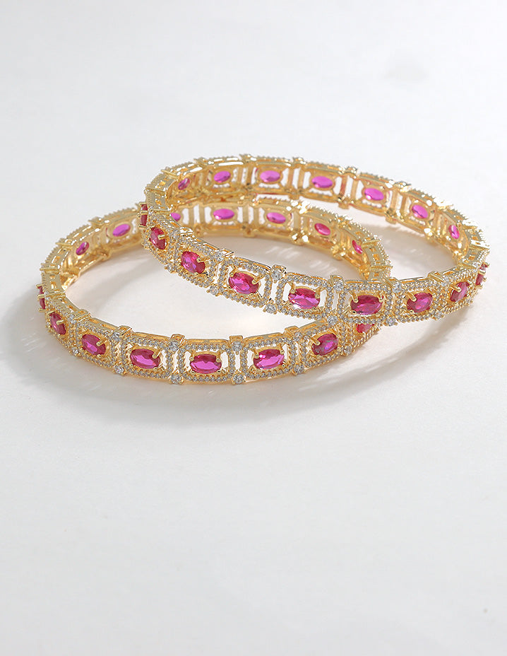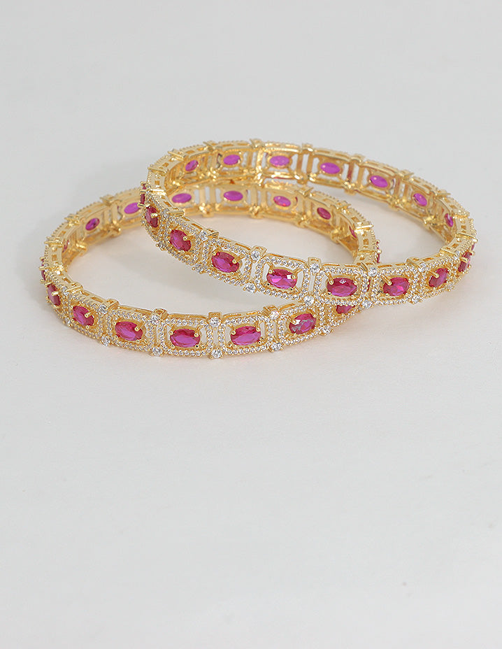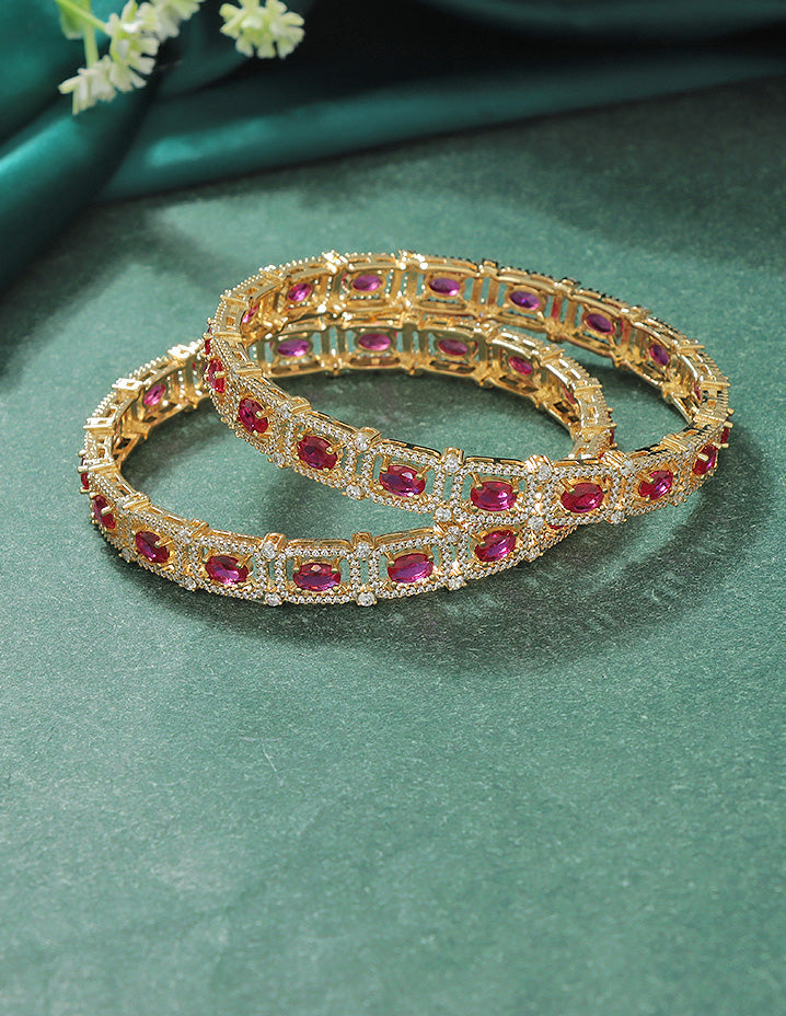 A luxurious blend of elegance and sparkle, these bangles showcase brilliant Ruby-cut green stones framed with shimmering white crystals. Set in a radiant gold finish, they are perfect for elevating your look at weddings, parties, or festive occasions.