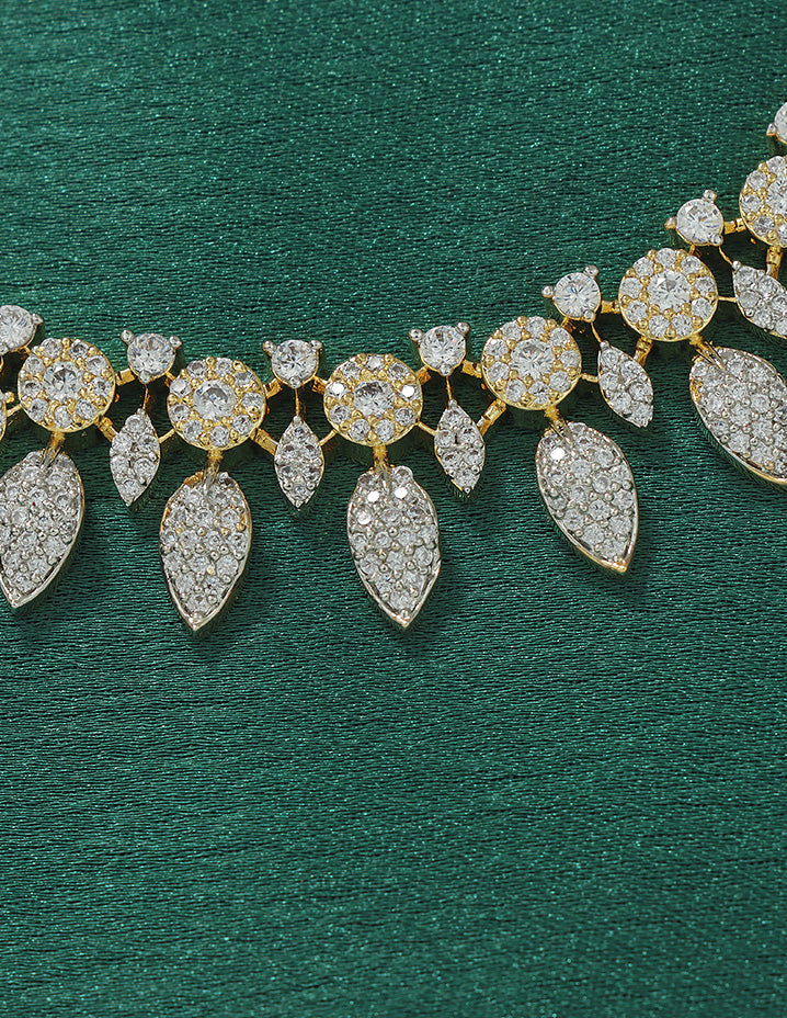 This Designer Zirconia Elegance Necklace Set features exquisite white stones set in a refined gold and rhodium polish, offering timeless sophistication. Perfectly crafted to elevate any ensemble with expert attention to detail and lasting brilliance.