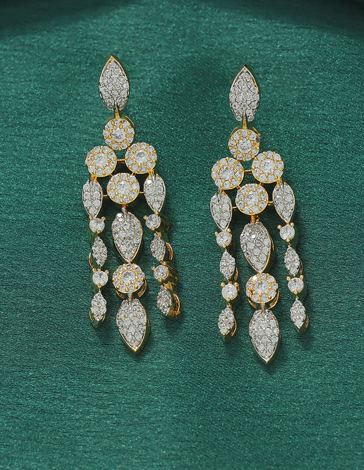 Designer earrings are classic jhumka-style danglers with a fusion of traditional and contemporary design. The bell-shaped drop is richly embellished with white stones and tear-drop dangles, paired with a sparkling oval top.