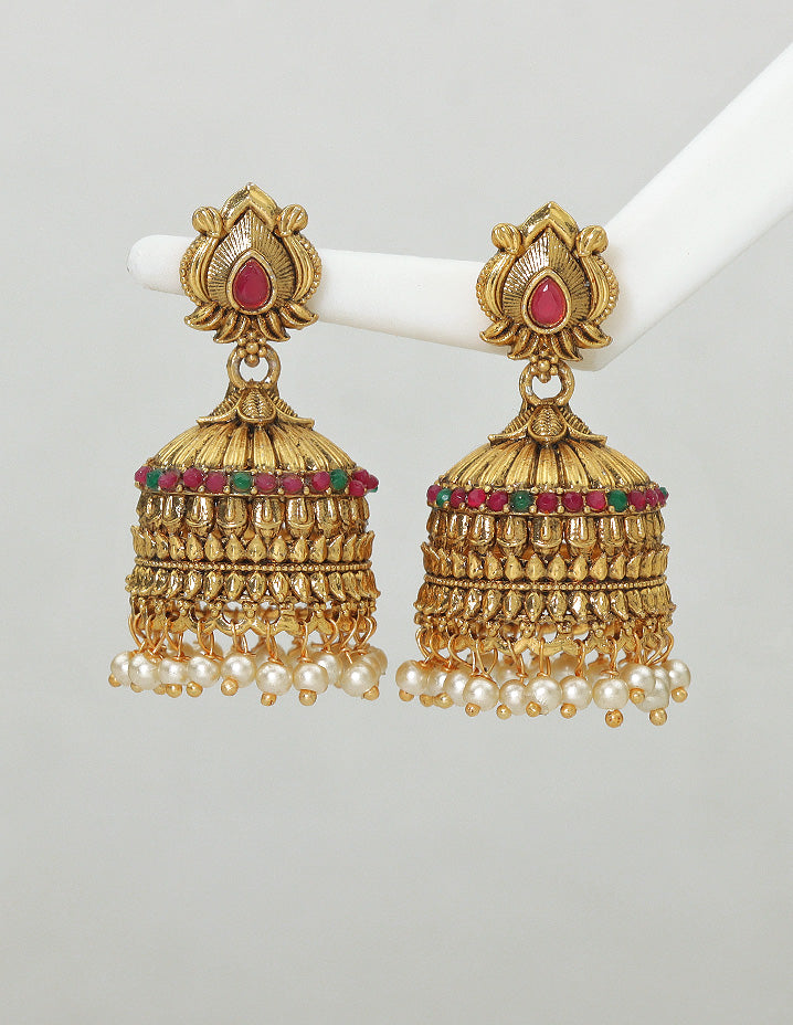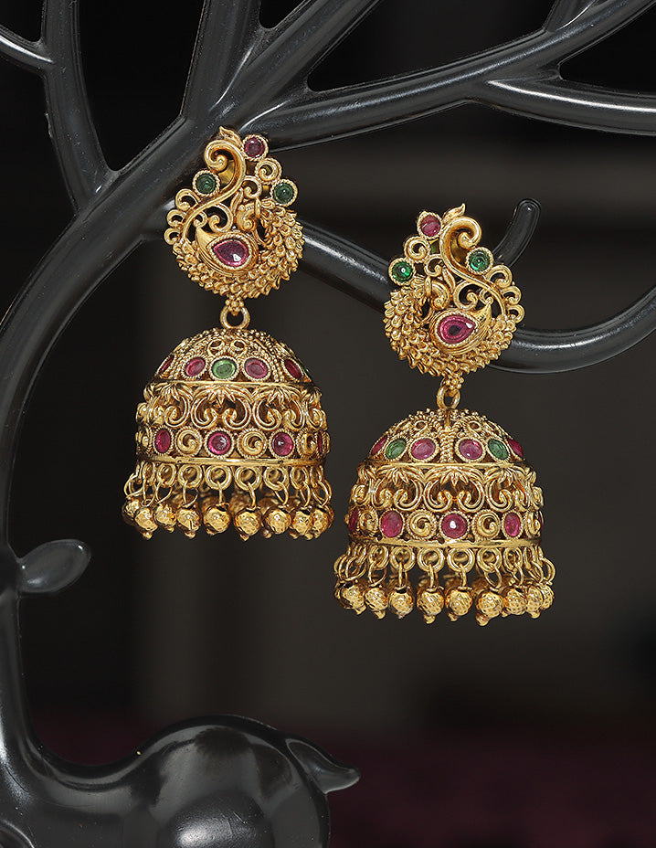 Adorned with intricate temple motifs, vibrant stones, and delicate pearl hangings, these antique gold jhumkas exude traditional charm—perfect for cultural celebrations and bridal elegance.