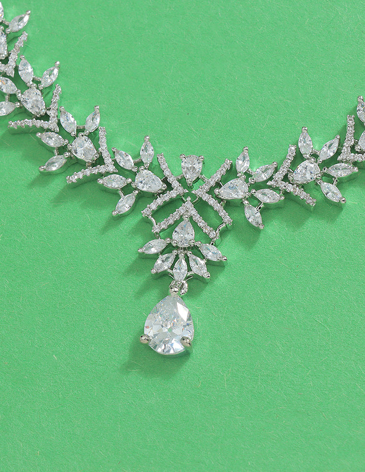 This Designer Zirconia Crystal Elegance Necklace Set features two exquisite lines of sparkling white zirconia stones, all delicately set in lustrous white rhodium. Its refined design delivers timeless sophistication, perfectly enhancing any formal or festive attire with subtle brilliance and expert craftsmanship.
