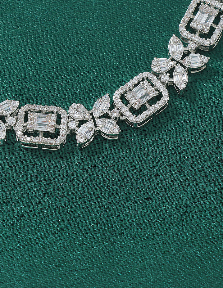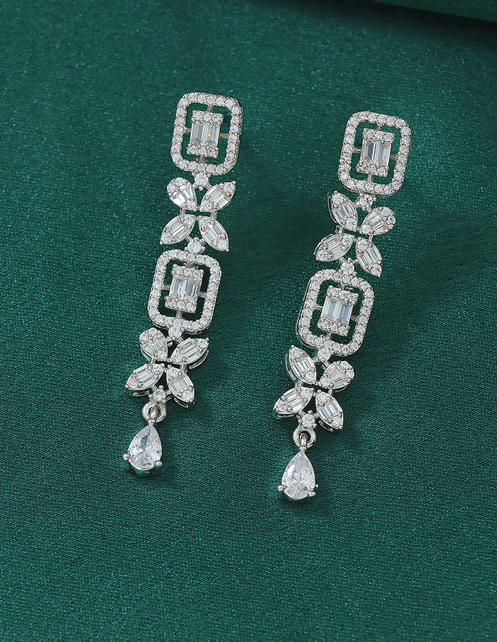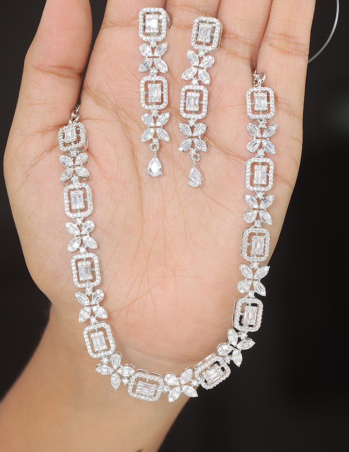 A radiant silver-toned necklace and earring set adorned with sparkling rectangular and floral motifs, perfectly blending elegance and charm for your special occasions.
