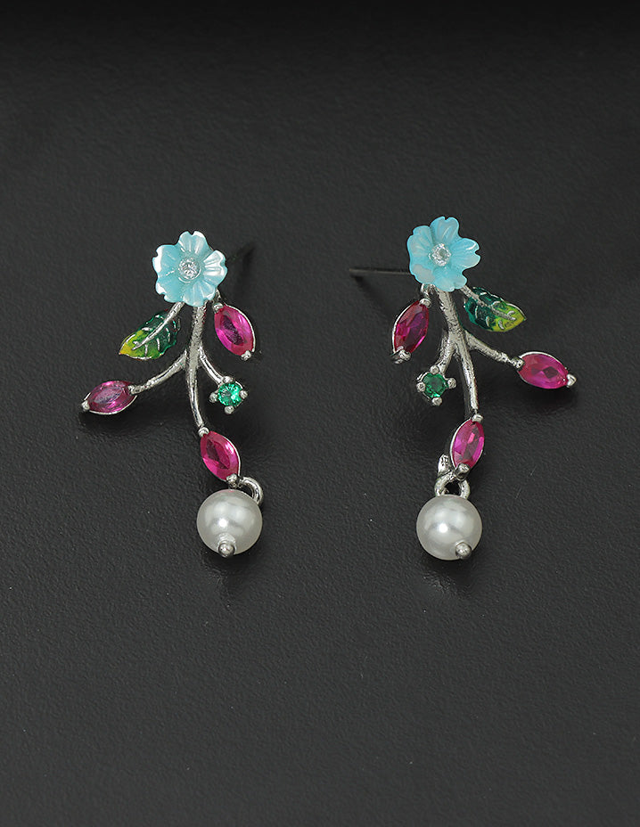 A radiant Rhodium-finish necklace set blooming with colorful floral motifs, shimmering crystals, and pearl drops. An elegant choice for festive wear, bringing a fresh burst of nature-inspired charm.