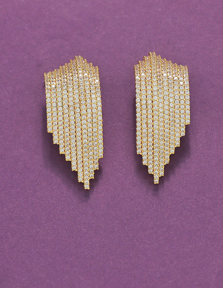 Designer earrings are classic jhumka-style danglers with a fusion of traditional and contemporary design. The bell-shaped drop is richly embellished with white stones and tear-drop dangles, paired with a sparkling oval top.