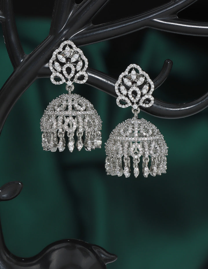 Shine bright with these rhodium-plated jhumkas, studded with white American diamonds. A bold fusion of elegance and tradition — perfect for any occasion!
