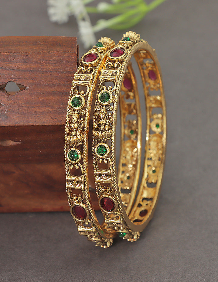 These Designer Matt Lakshmi Devi Bangles feature intricate goddess motifs with a subtle matte finish, blending tradition and elegance. Perfectly crafted for both festive and everyday wear, they symbolize prosperity with lasting comfort.