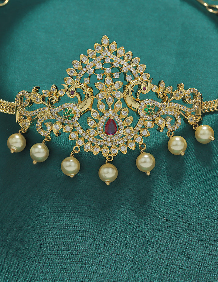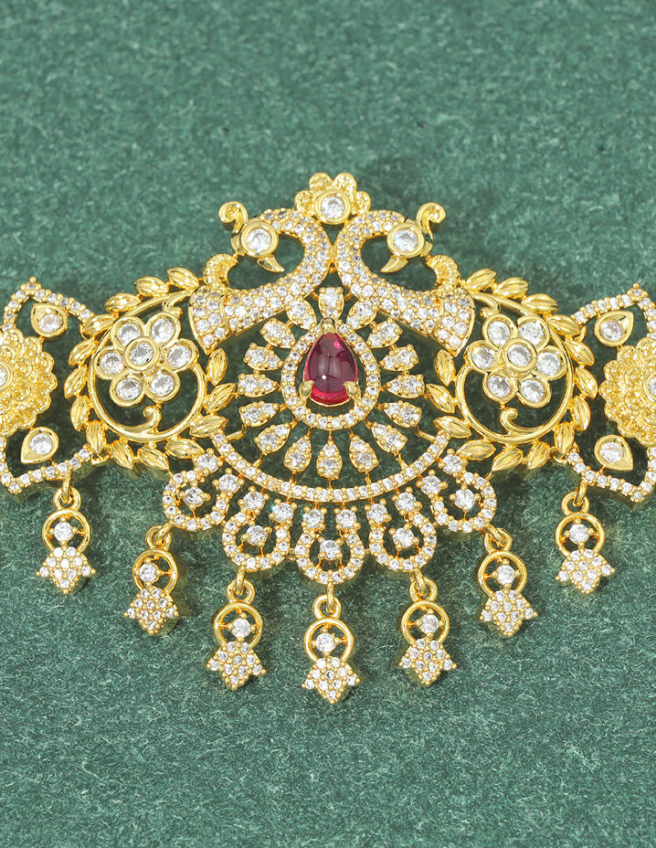This Designer Zirconia Mango Shape Chain Vaddanam features ruby and white tones with a sophisticated gold matt polish, appealing to customers who value elegant and timeless ethnic jewelry. It is crafted for those seeking exquisite detail and lasting comfort in their traditional accessories.