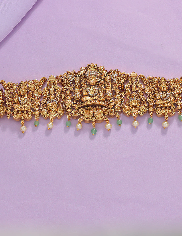 The Designer Matt Lakshmi Devi Beads Chain Vaddanam appeals to customers who value intricate zirconia detailing and traditional elegance. It meets the demand for ornate, culturally significant jewelry with a modern designer finish.