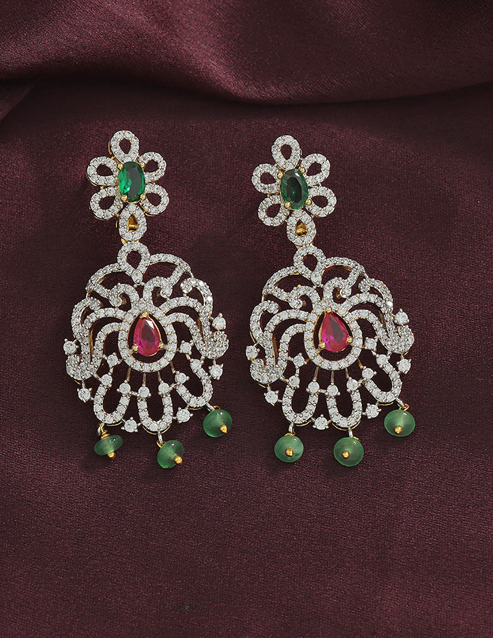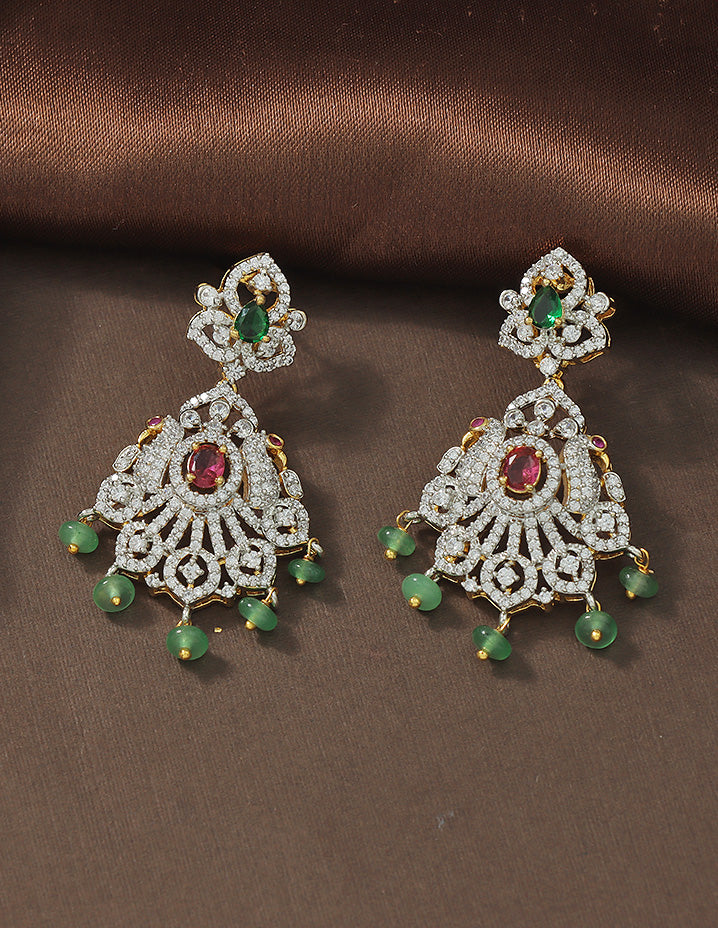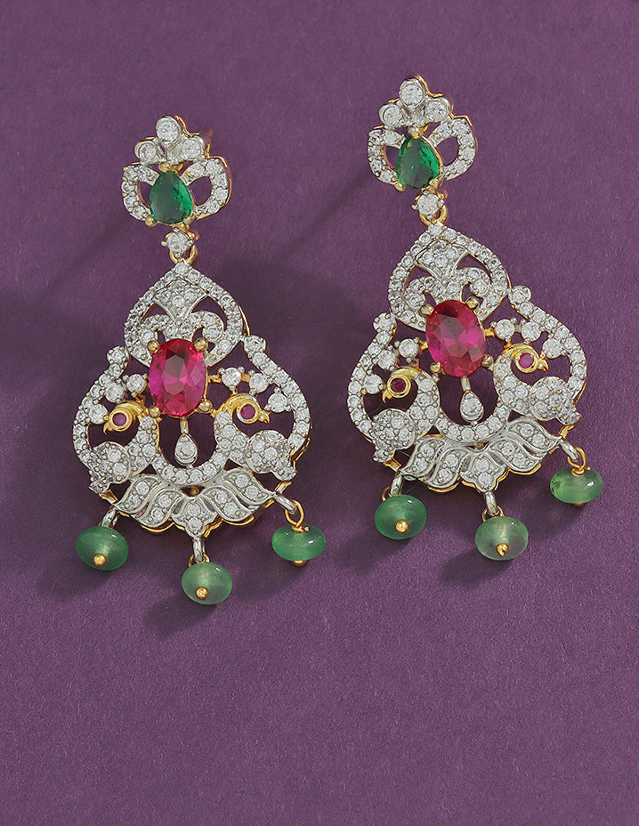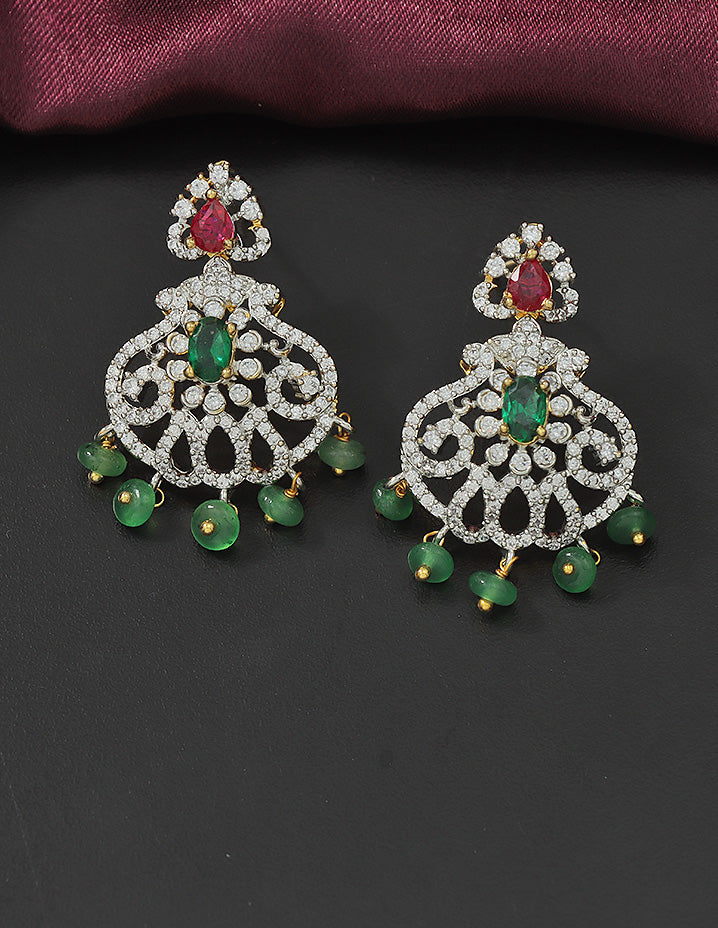Add a touch of glam to your Indian fits with these classic CZ matte polish jhumkas.Elegant, timeless, and adorned with kempu, ruby & emerald stones – a true stunner!
