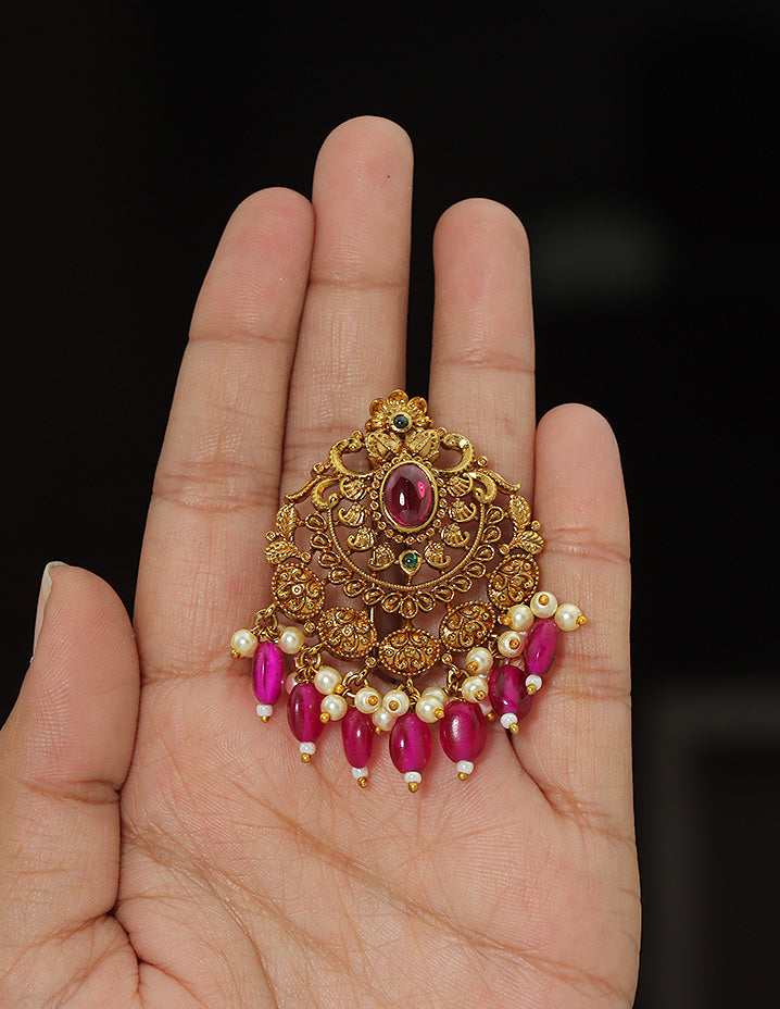 A majestic temple-style Choti Piece featuring an ornate gold finish, centered ruby stone, intricate motifs, and rich danglings of pearls and ruby beads—perfect for traditional grandeur.