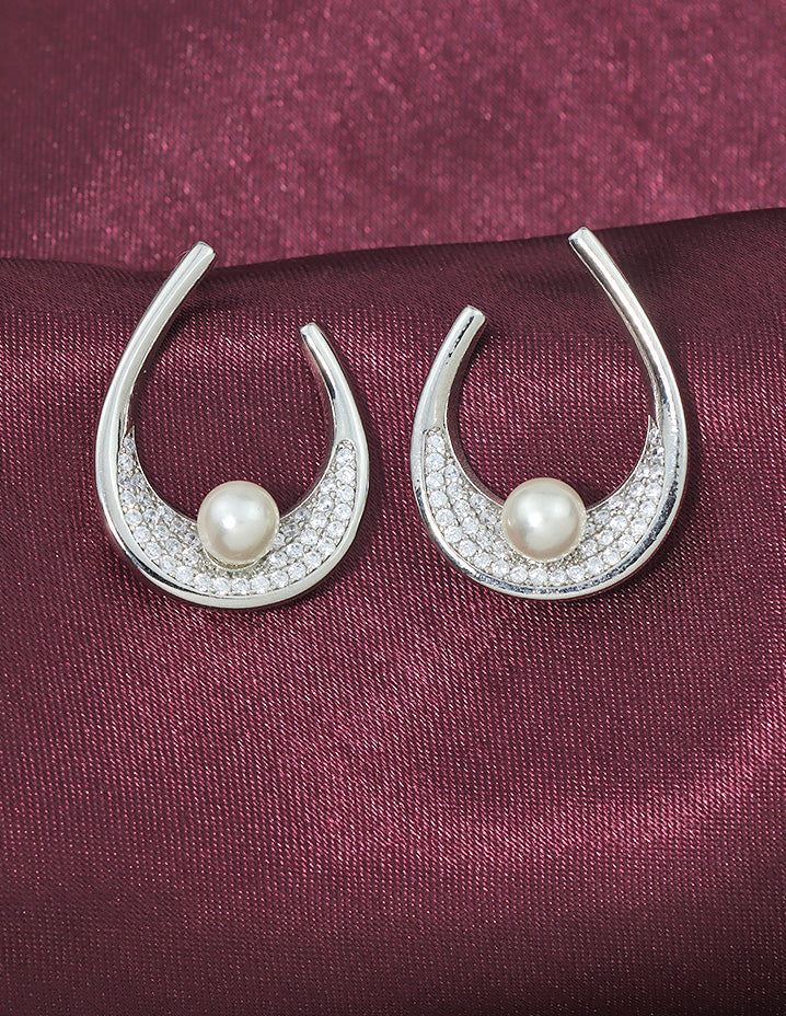 These elegant crescent-shaped earrings feature a stunning blend of tradition and glamour. Crafted in a lustrous Different finish, the design is encrusted with shimmering white stones that add a radiant sparkle. At the heart of each piece lies a luminous pearl, adding a classic and sophisticated touch. Perfect for both festive occasions and formal gatherings, these earrings beautifully combine modern design with timeless charm.