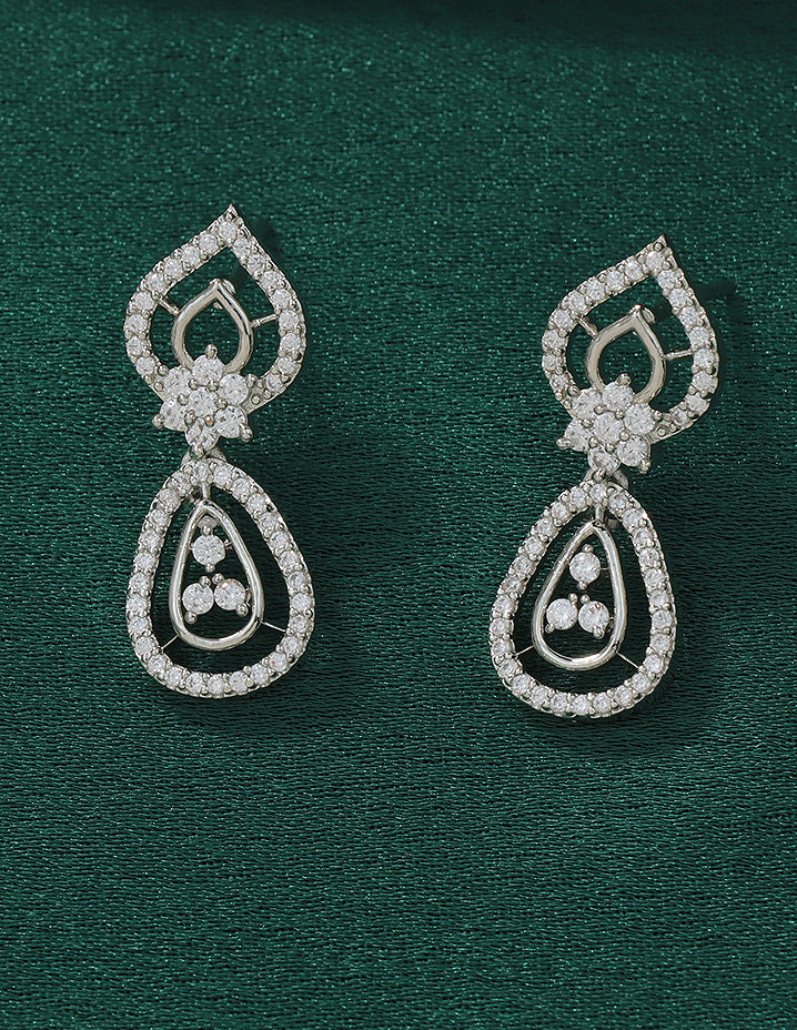 A radiant silver-toned necklace and earring set adorned with sparkling Bud and floral motifs, perfectly blending elegance and charm for your special occasions.
