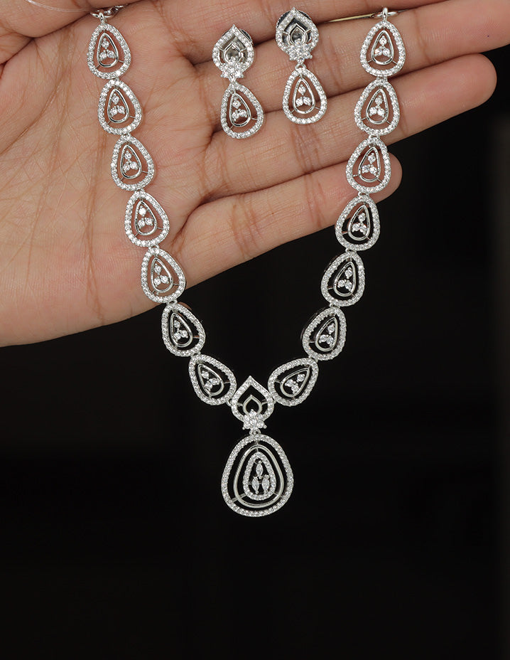 This stunning GJ-polish CZ necklace set is the perfect blend of elegance and charm. Its eccentric design, studded with sparkling American diamond stones, is a true visual treat.