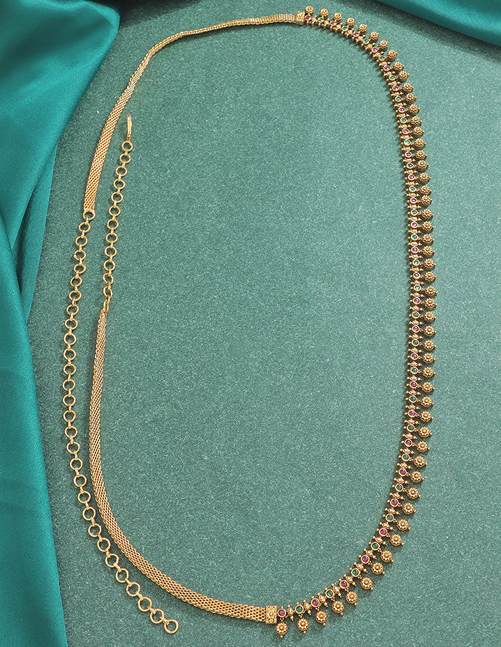 This Designer Kempu Matt Chain Vaddanam features a finely crafted matt finish that adds a subtle sophistication to traditional attire. Adorned with ruby and emerald stones arranged in two elegant lines, it brings a rich blend of color and charm, perfect for accentuating festive and ceremonial looks with expert craftsmanship.