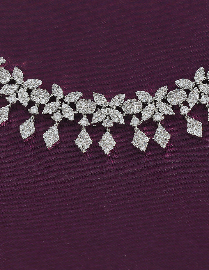 A radiant Rhodium-toned necklace and earring set adorned with sparkling Bud and floral motifs, perfectly blending elegance and charm for your special occasions.