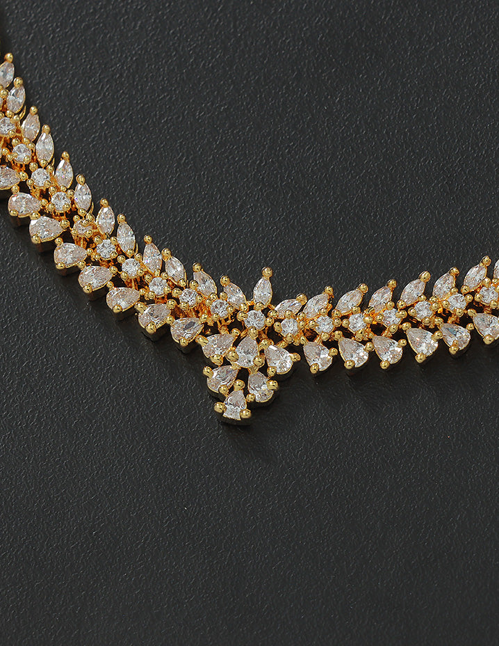 Elevate your style with this Designer Zirconia Elegance Necklace Set, featuring radiant white stones and a refined gold polish for timeless sophistication. Perfectly crafted to add a luxurious touch to any ensemble.