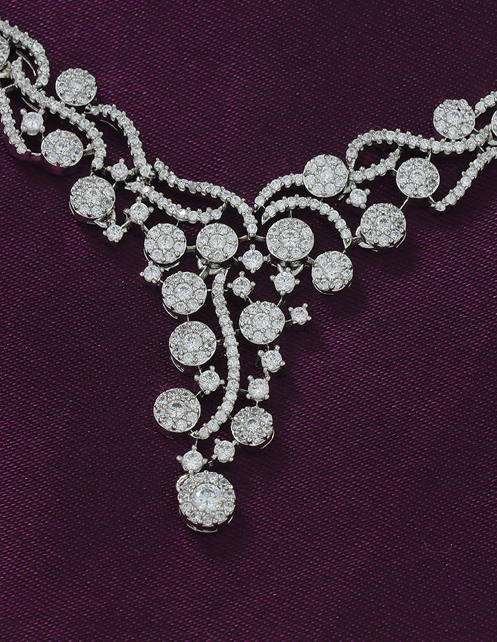 A radiant Rhodium-toned necklace and earring set adorned with sparkling Bud and floral motifs, perfectly blending elegance and charm for your special occasions.