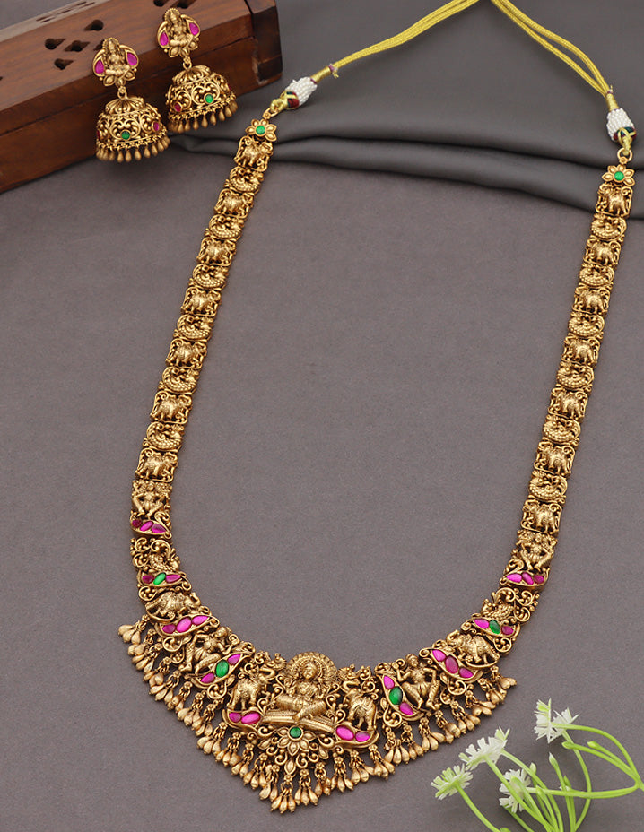 Designer Lakshmi Devi Necklace Set adorned with vibrant ruby kempu stones. Finished in a refined matt polish, showcasing intricate craftsmanship.
