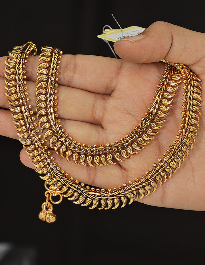 Step into elegance with this beautifully layered anklet set, adorned with intricate bud-shaped motifs and traditional detailing. The antique gold finish adds a royal charm, making it a stunning choice for weddings, festivals, and classical dance ensembles.