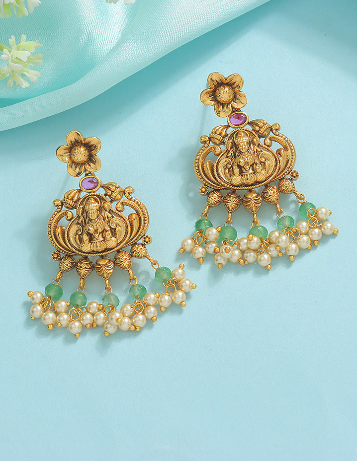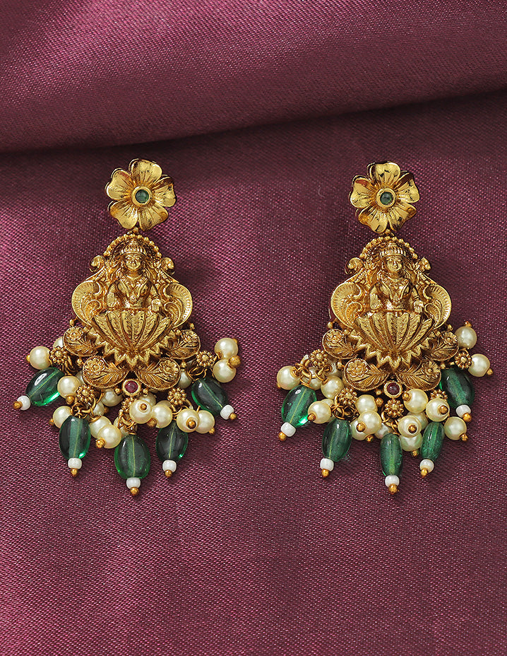 Adorned with intricate temple motifs, vibrant stones, and delicate pearl hangings, these antique gold jhumkas exude traditional charm—perfect for cultural celebrations and bridal elegance.