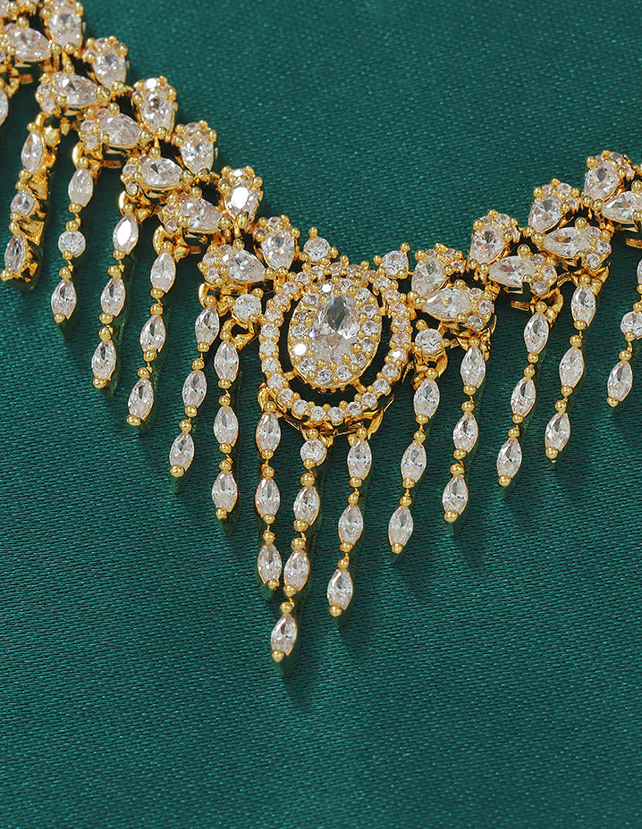 Elevate your style with this Designer Zirconia Elegance Necklace Set, featuring radiant white stones and a refined gold polish for timeless sophistication. Perfectly crafted to add a luxurious touch to any ensemble.