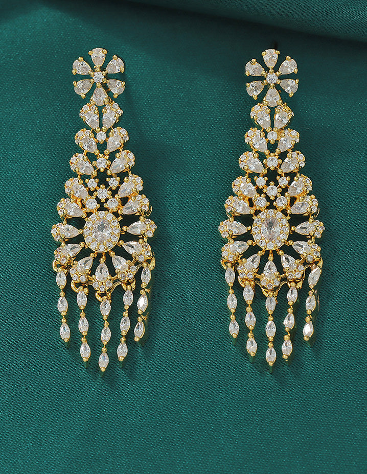 Make a statement with our Designer Zirconia Floral Stud Earrings, perfect for evening events. Features a rhodium and gold polish with dazzling white AD stones.