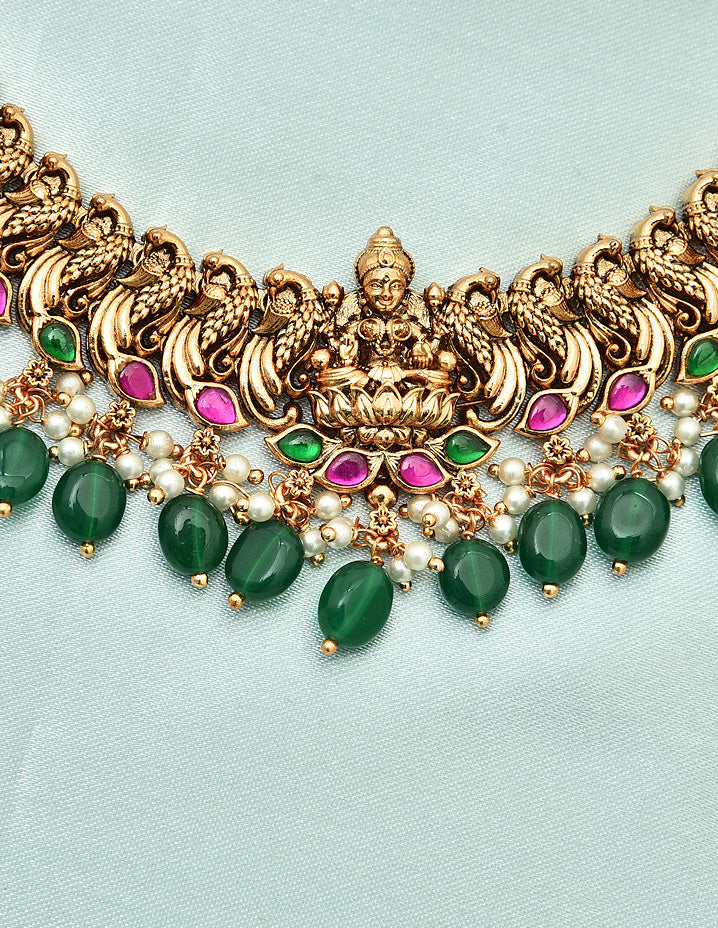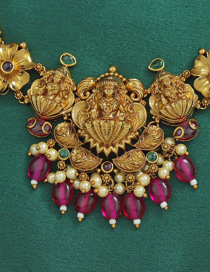 This Designer Lakshmi Devi Necklace Set features exquisite ruby and emerald stones with a refined matt polish finish. Its elegant two-line design blends traditional artistry with sophisticated charm.