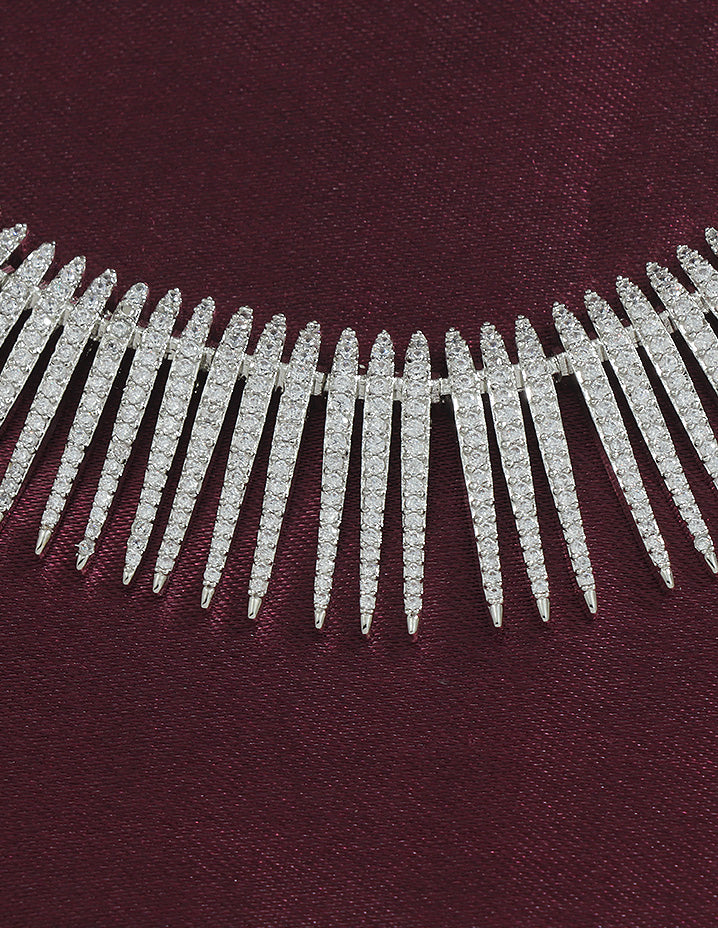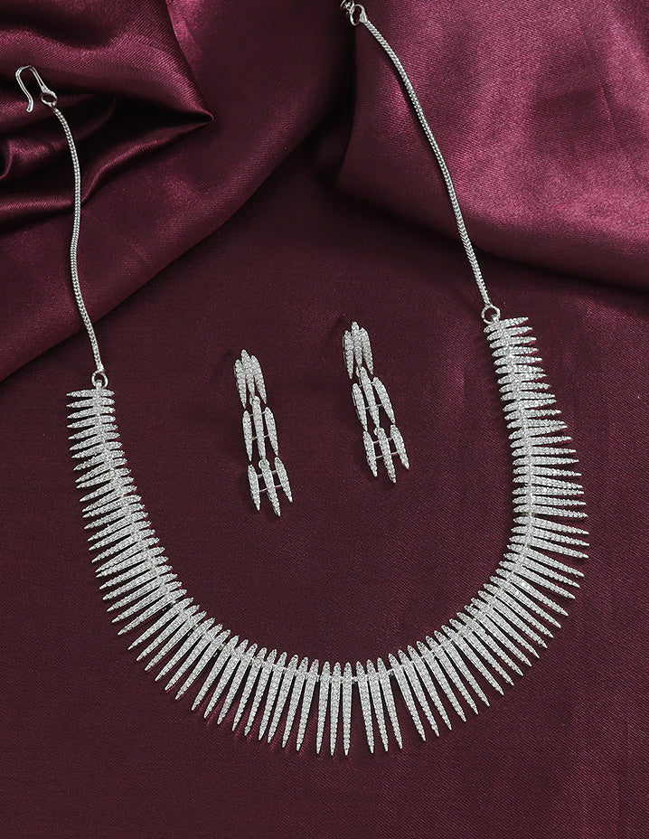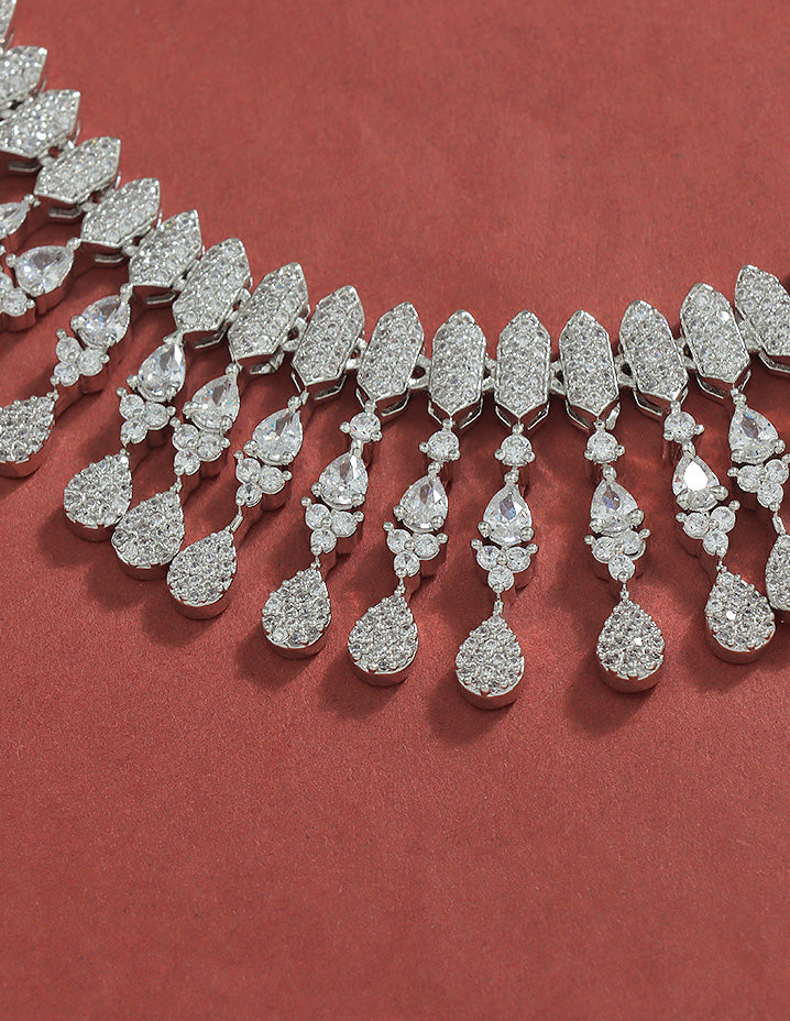 This Designer Zirconia Elegance Necklace Set features sparkling white stones enhanced by a durable rhodium polish. Its refined craftsmanship adds a sophisticated glow to any ensemble.