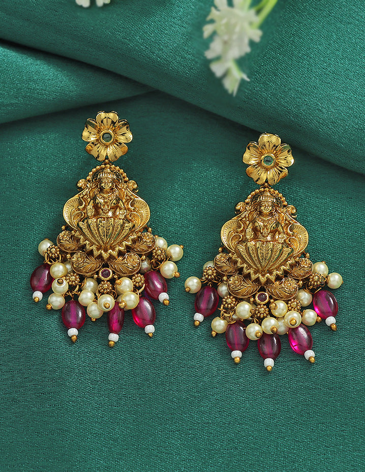 Designer Matt Kempu Jhumka Earrings showcase finely detailed ruby Lakshmi Devi butta. These earrings blend traditional artistry with contemporary sophistication.