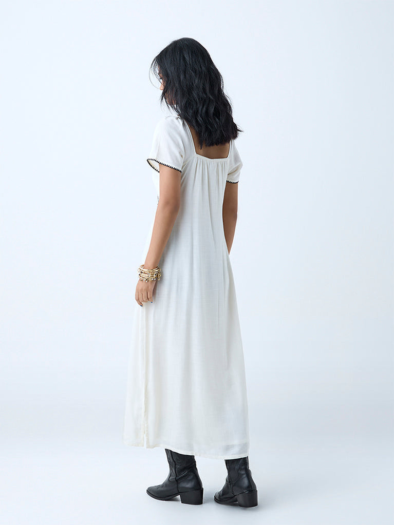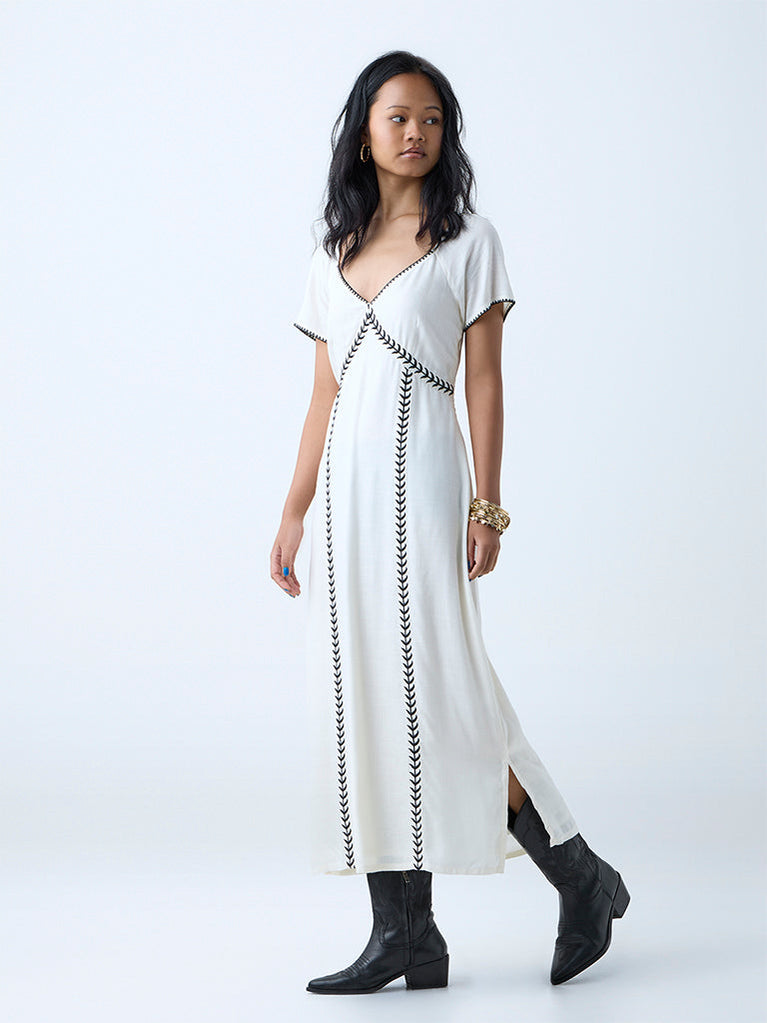 Bring a touch of nature-inspired elegance to your wardrobe with this white dress from Bombay Paisley. Accented with leaf embroidery, it’s made from quality fabric and features a flattering plunge neck and short sleeves.