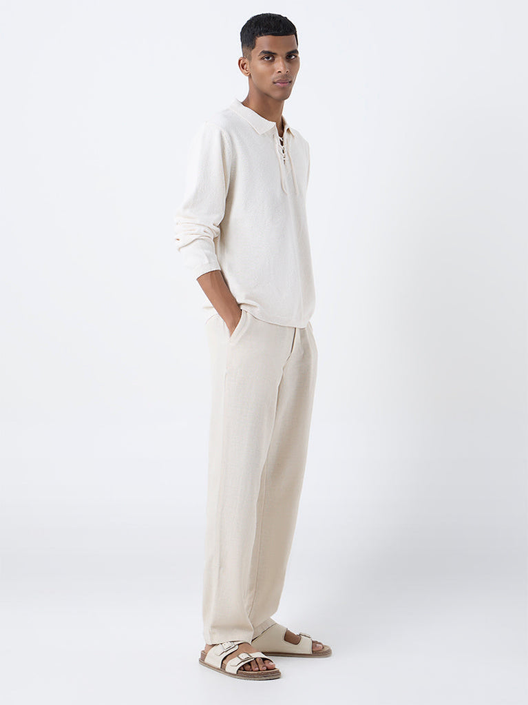 These off-white pants from Bombay Paisley showcase geometric-inspired motifs that add a subtle yet striking touch. Made from a premium cotton-linen blend, they feature a buttoned waist, zipper fly, and practical belt loops. Designed with side pockets for everyday ease, this pair balances comfort with contemporary charm.