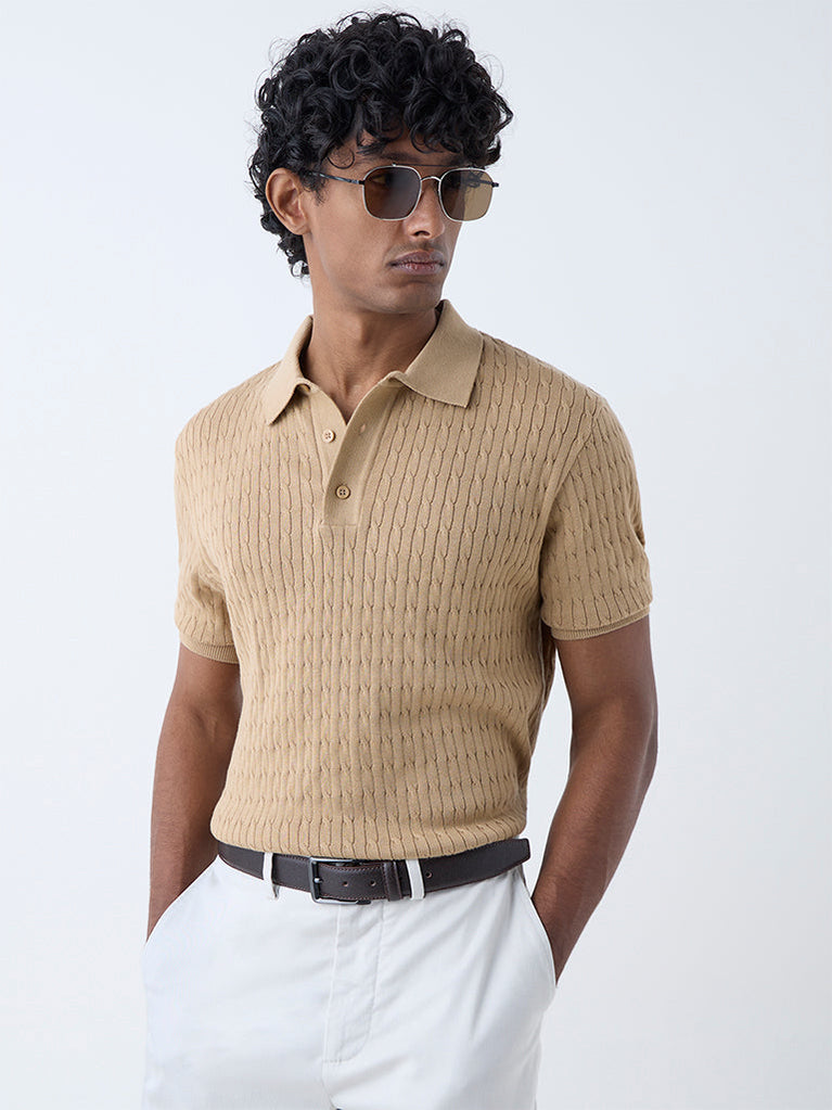 This beige polo t-shirt from Ascot redefines casual polish with its cable-knit finish and clean construction. Spun from a cotton-rich fabric, it’s cut in a relaxed silhouette and styled with a polo collar, short button placket, and half sleeves.