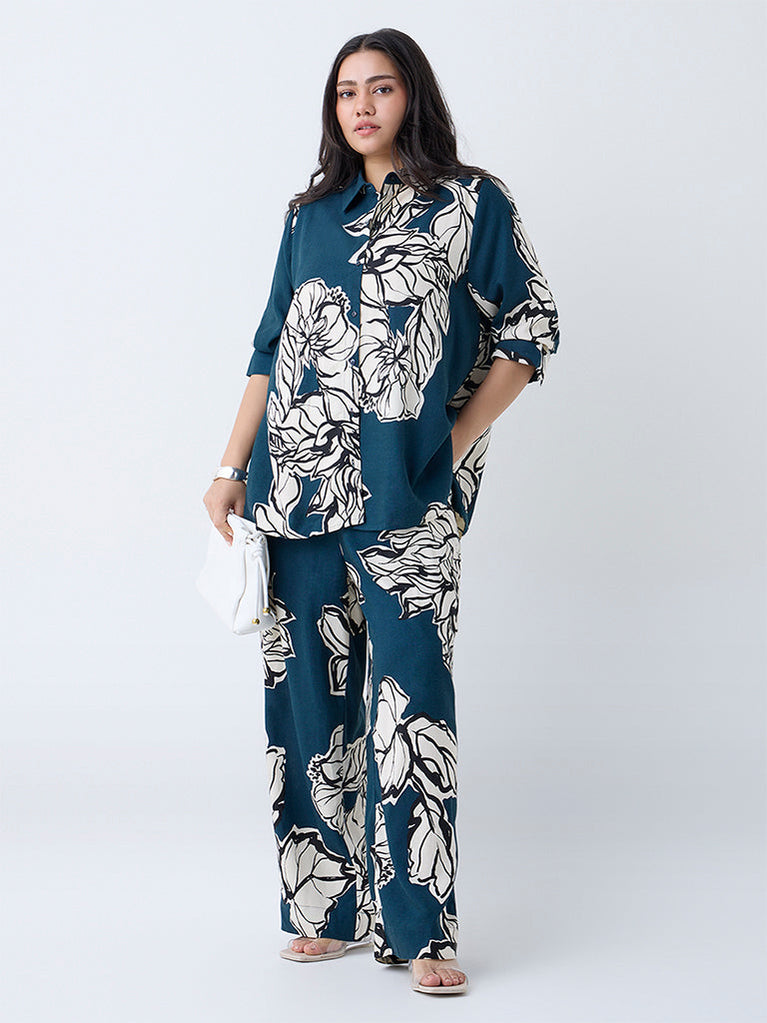 The teal shirt by Gia is adorned with foliage motifs that lend a sophisticated, nature-inspired touch. Milled from a sumptuous, fluid fabric, it features a classic collar and button placket that frame the neckline beautifully. three-quarter sleeves add graceful coverage, creating a flattering silhouette that pairs effortlessly with wide-leg trousers, denims, or co-ords.