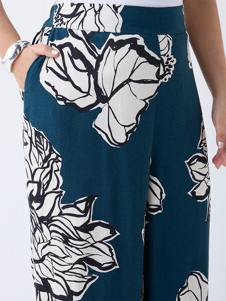 Teal trousers by Gia crafted with subtle foliage motifs that bring visual interest while elongating the frame. Designed in a breathable fabric with a gentle drape, they feature an elasticated waistband for a contoured yet comfortable fit. Side pockets ensure everyday ease, making them a stylish essential for polished weekday dressing or relaxed weekend looks.
