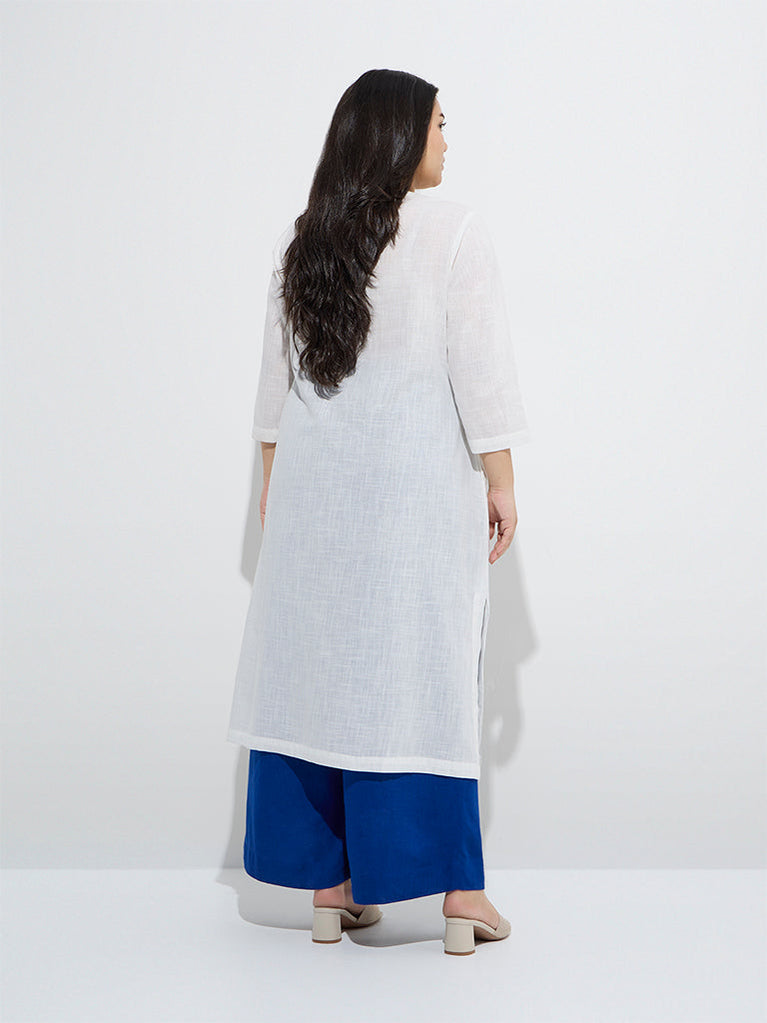 This indigo kurta from Diza is brought to life with graceful botanical prints that offer a refreshing contrast against its deep base. Tailored from a breathable fabric in a flattering A-line silhouette, it’s styled with a crisp collar, a short button-down placket, and three-quarter sleeves for a polished finish. Thoughtfully designed with a slip pocket, it blends everyday ease with artistic flair.