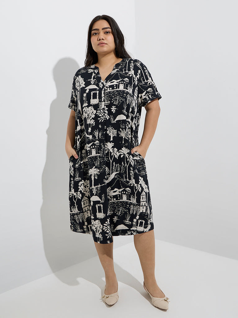 This black dress from Gia is adorned with scenic-inspired prints that lend an artistic flair to your everyday wardrobe. Woven from pure cotton, it promises breathable comfort for all-day wear. The mandarin neck and half sleeves come together to create a relaxed silhouette that’s perfect for casual outings or laid-back gatherings.