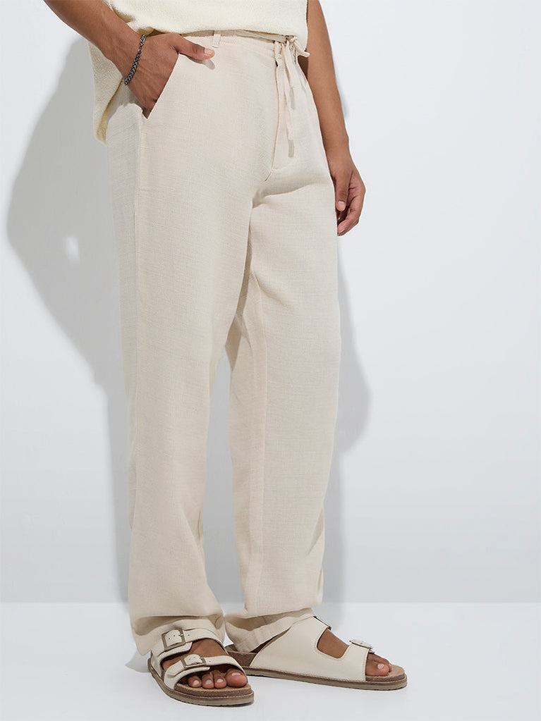 These beige chinos from ETA are tailored from a comfortable cotton-blend fabric in a solid hue. Cut in a relaxed fit, they come fitted with a buttoned waistband, adjustable drawstrings, belt loops, and a zipper fly. Multiple pockets add a practical touch to this laid-back essential.
