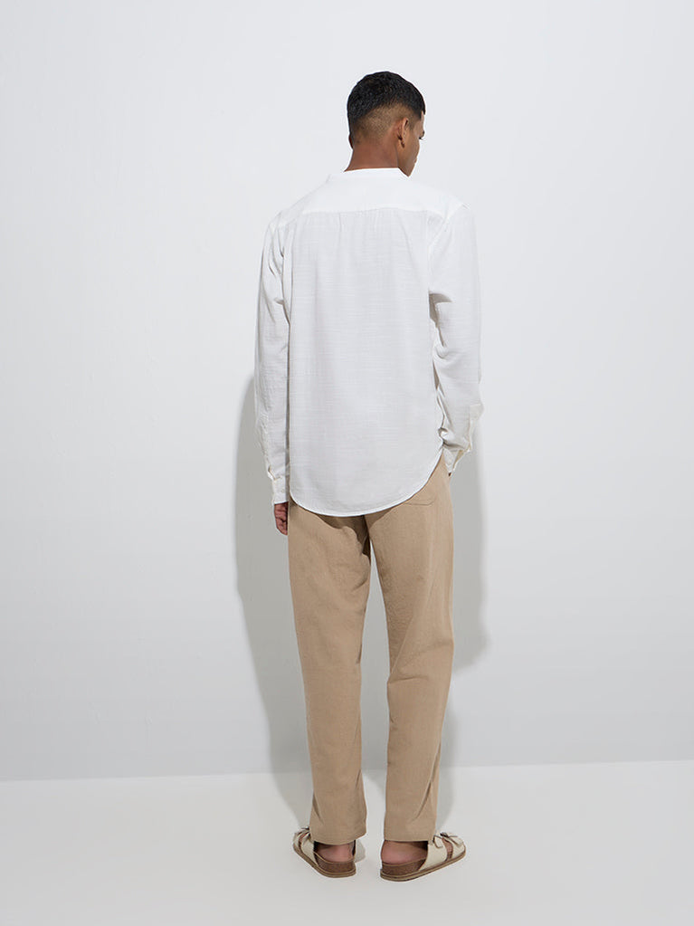 ETA introduces effortless sophistication with this off-white shirt, tailored in a relaxed fit for everyday ease. Designed with a band-neck collar, button placket, and full sleeves, it is woven from a sumptuous linen-blend fabric for elevated comfort.