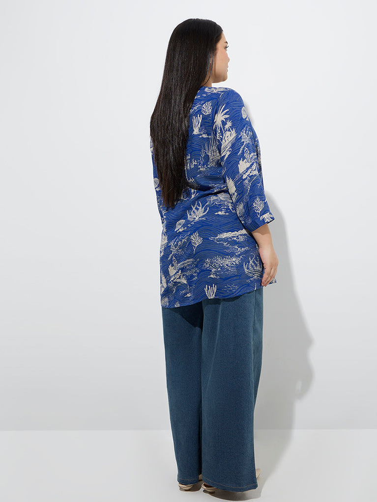 This indigo ethnic kurti from Diza is milled from a super-soft fabric for effortless all-day comfort. Featuring all-over scenic prints, it is detailed with a mandarin neck, a brief button placket, and three-quarter sleeves, blending timeless style with easy wearability.