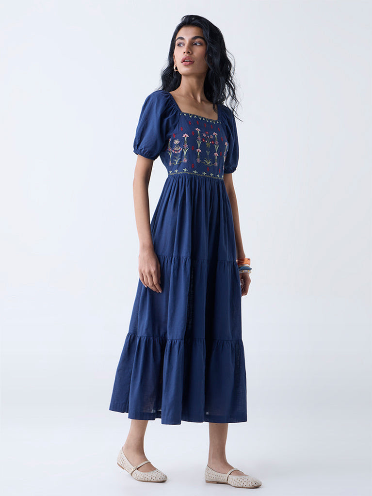 Bombay Paisley Dark Blue Embroidered Cotton Tiered Dress