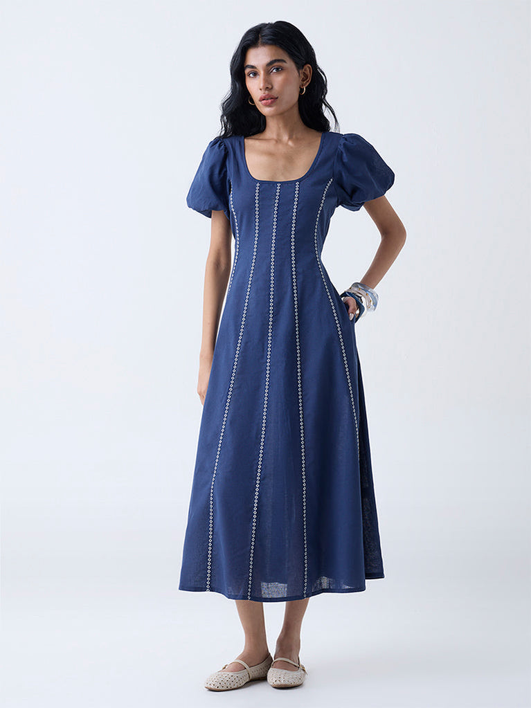 Bombay Paisley Dark Blue Embroidered Cotton A-Line Dress