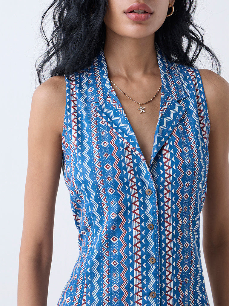 Bombay Paisley Blue Aztec Printed Cotton-Blend Shirt Dress