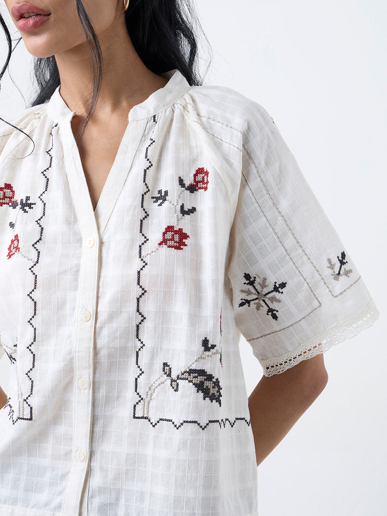 Crafted with a keen eye for detail, this off-white shirt from Bombay Paisley showcases cross-stitch floral embroidery that brings a handcrafted, heritage-inspired nuance to the silhouette. Cut from pure cotton for a soft, breathable feel, it features a mandarin neckline flowing into a button placket and relaxed short sleeves.